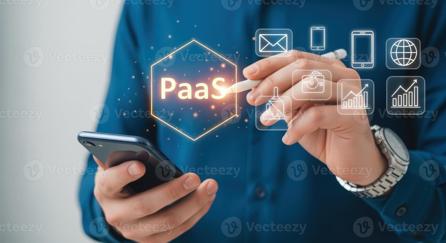 Man Interacting with Platform as a Service PaaS Concept on Smartphone, Pointing at Digital Interface with Stylus Pro Photo