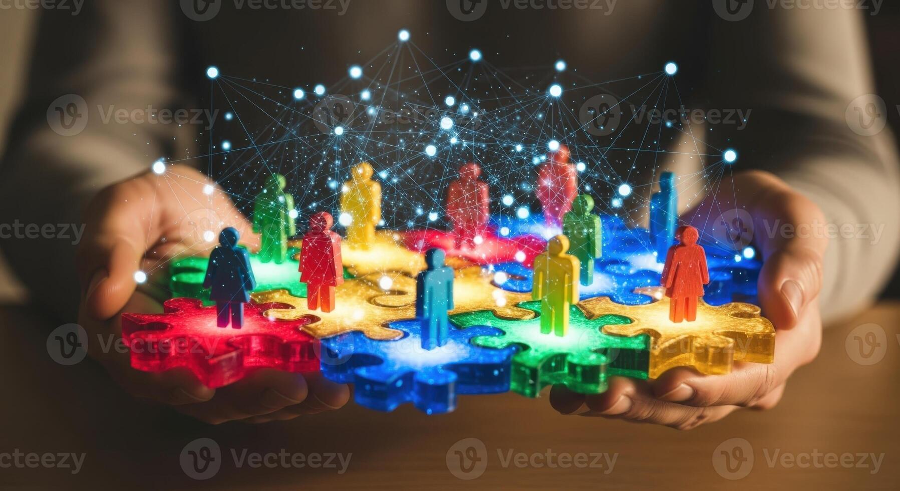 Connected Teamwork Diverse Figures Standing on Interlocking Gears Symbolizing Collaboration, Unity, and Technological Network in Human Hands Pro Photo