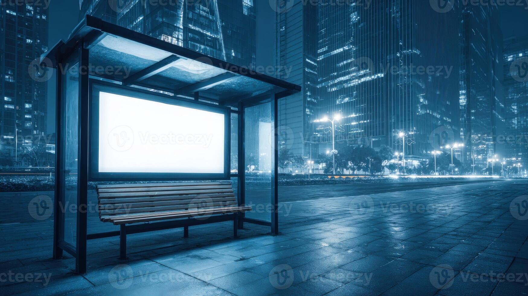 Cityscape at Night Illuminated Bus Stop Billboard with Blank Advertisement Space for Custom Messaging Pro Photo