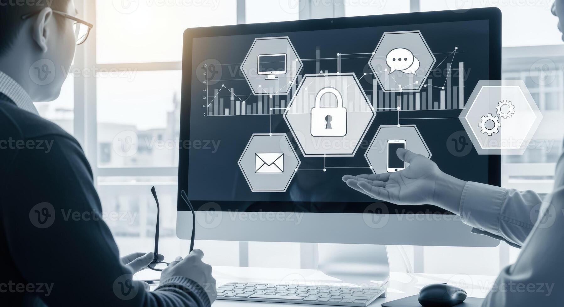 Data Protection and Cybersecurity Businessmen Discussing Security Measures Displayed on a Computer Screen in a Modern Office Pro Photo