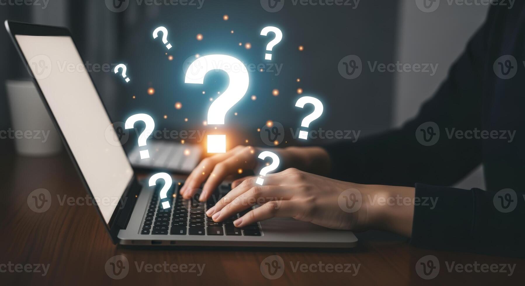 Typing on Laptop Surrounded by Question Marks Seeking Answers, Solutions, and Information Online Pro Photo