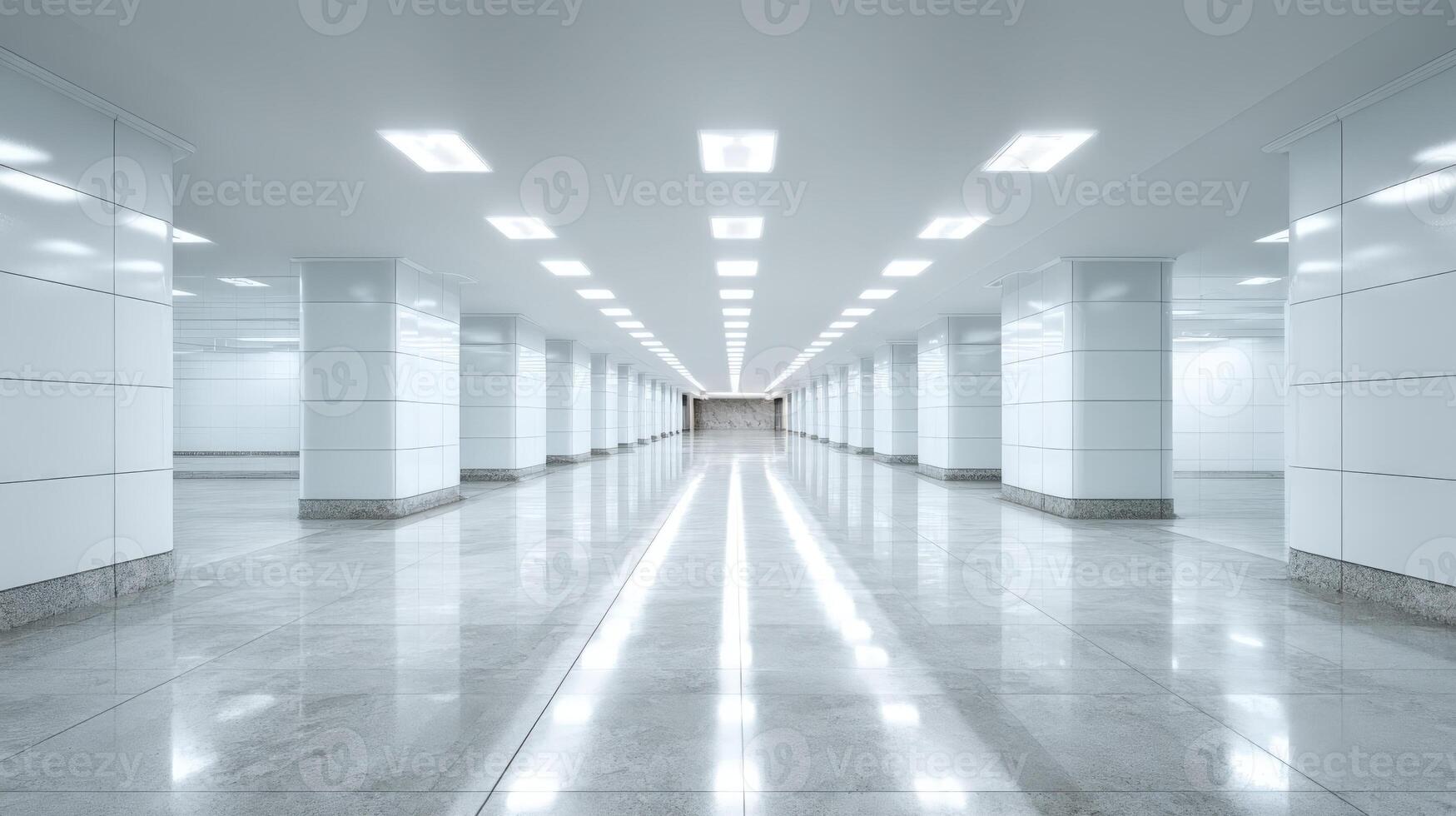 Endless White Corridor with Symmetrical Columns and Reflections, Ideal for Modern Design and Architectural Concepts Pro Photo