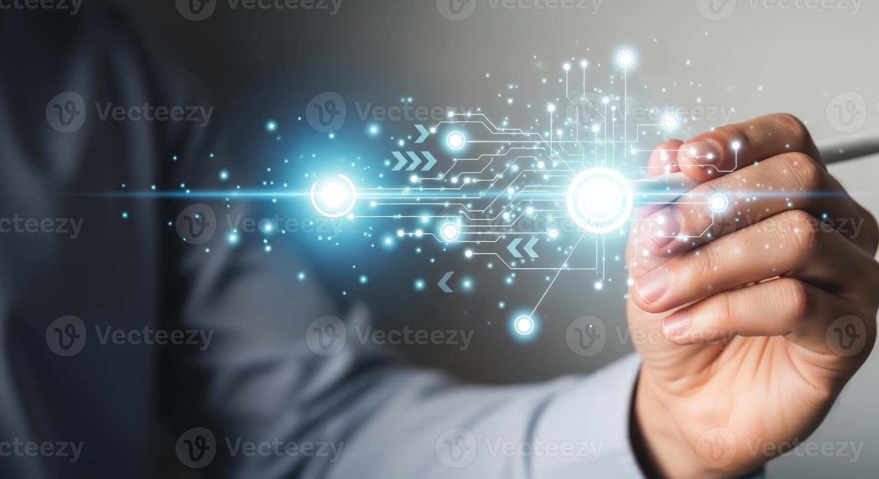 Digital Transformation Concept Person Interacting with Futuristic Interface for Data Analysis and Technological Advancement Pro Photo