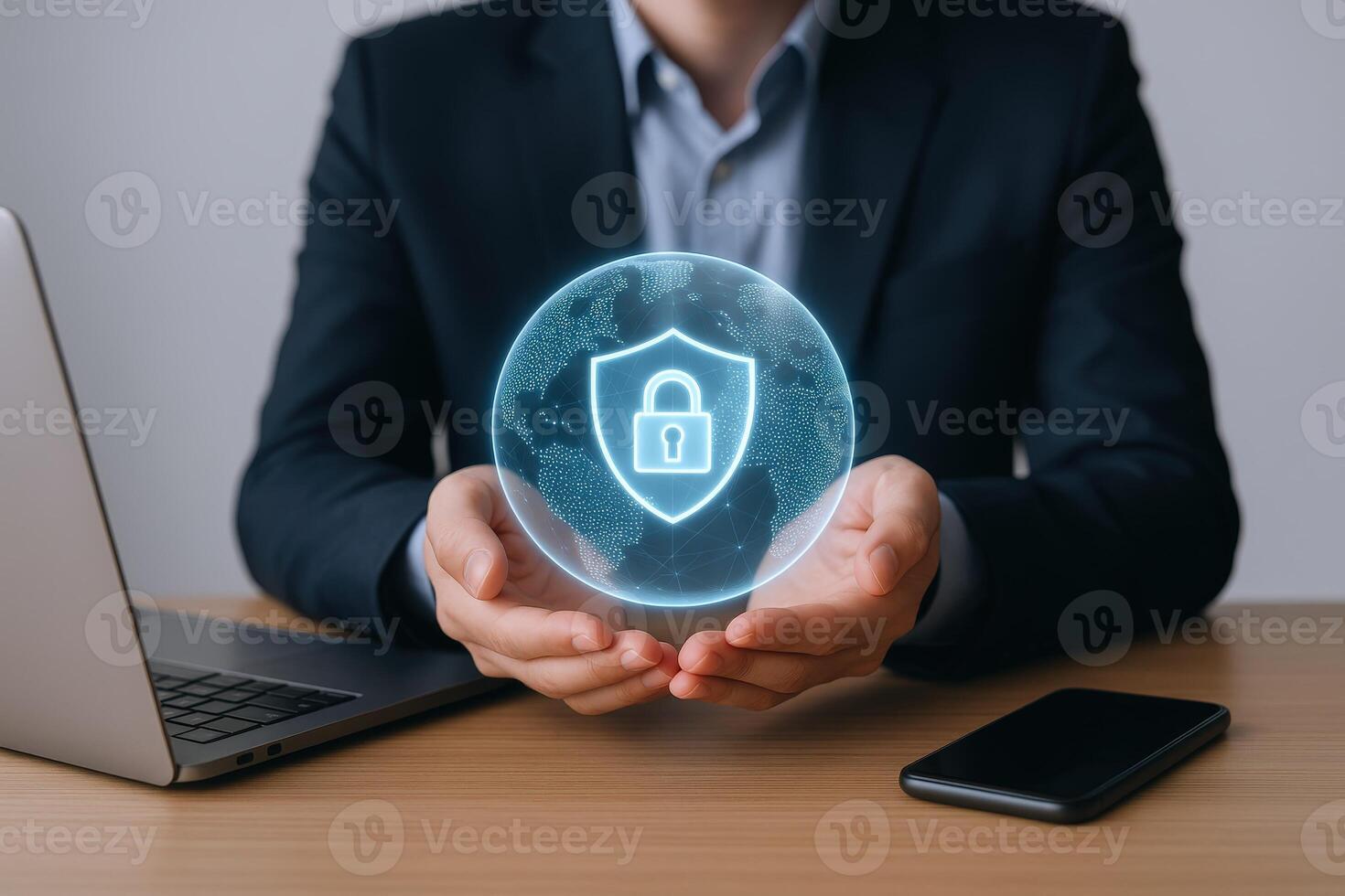Businessman holding a digital globe with shield and padlock icon, representing cybersecurity and data protection Pro Photo
