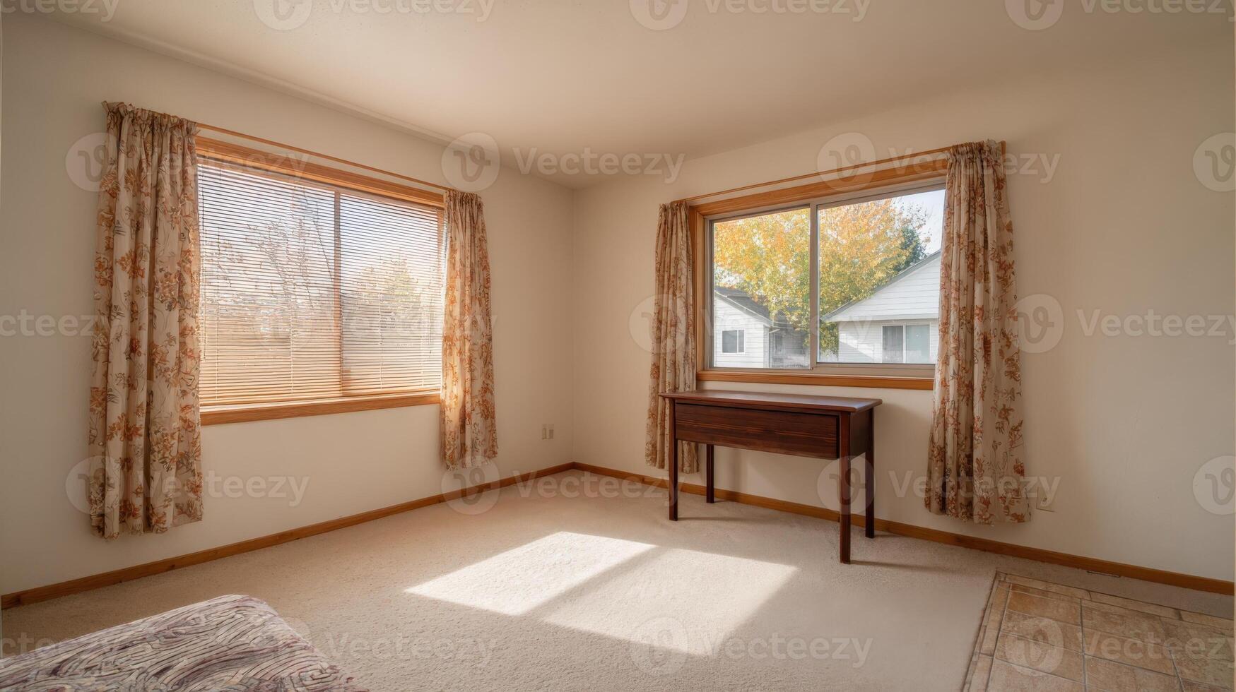 Bright Empty Room with Natural Light, Two Windows and a Table in Residential Home Pro Photo