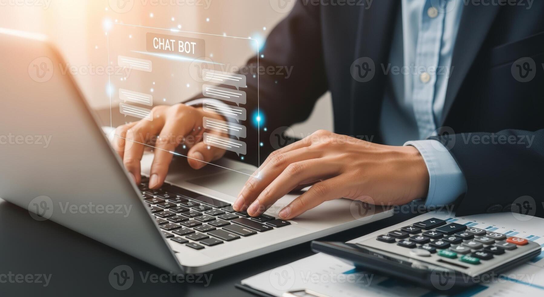 Businessman Using Chatbot Technology on Laptop for Business Communication and Automation, Modern Digital Technology Pro Photo