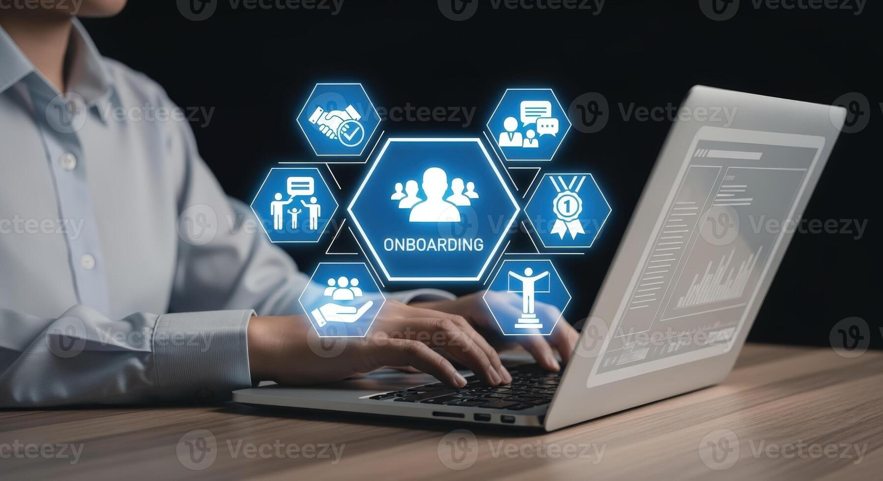 Onboarding Process Visualization Business Woman Navigating Employee Integration with Digital Interface on Laptop Pro Photo