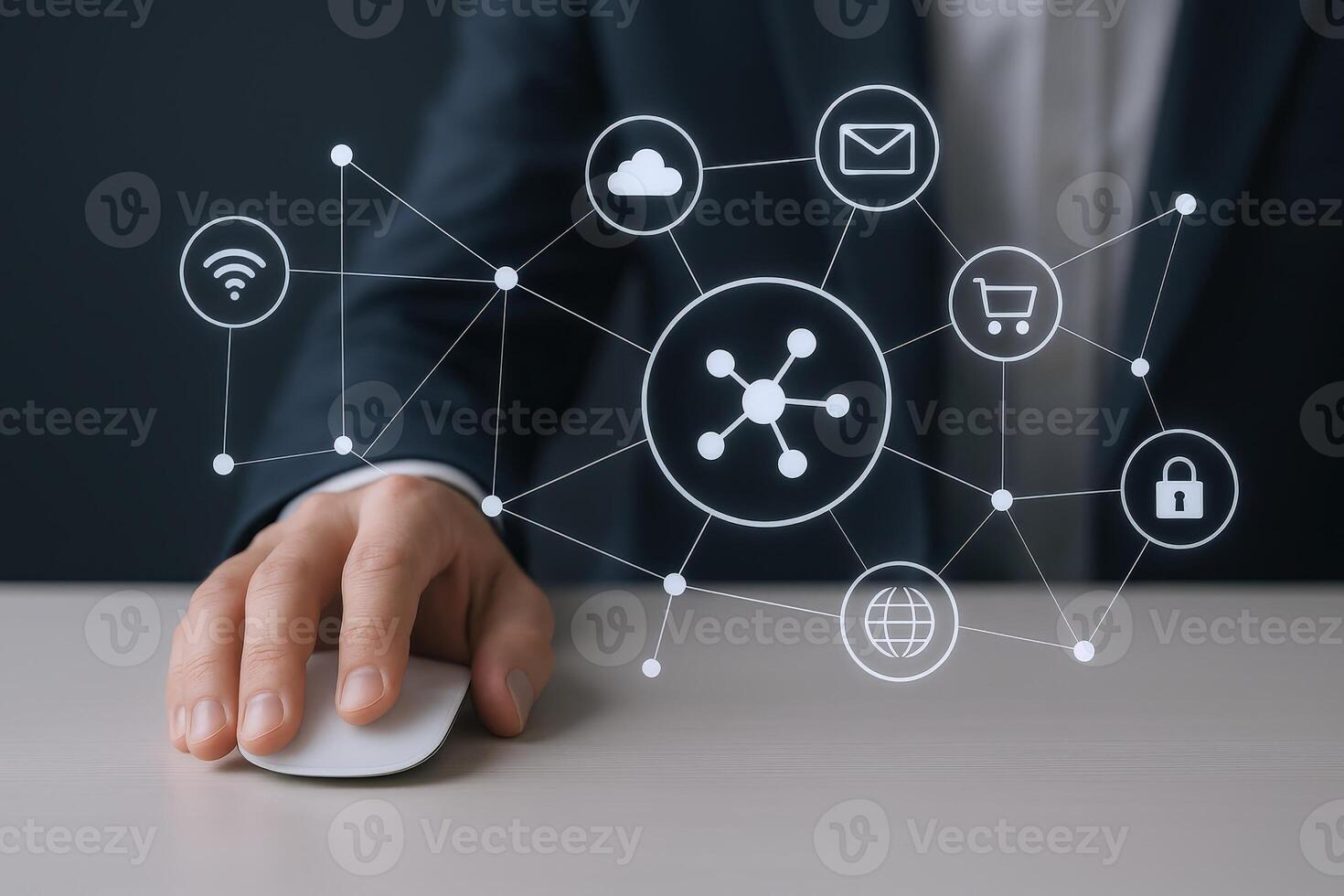 Businessman Navigating Cloud Network Hands on Mouse with Digital Interface, Connectivity, and Global Communication Pro Photo