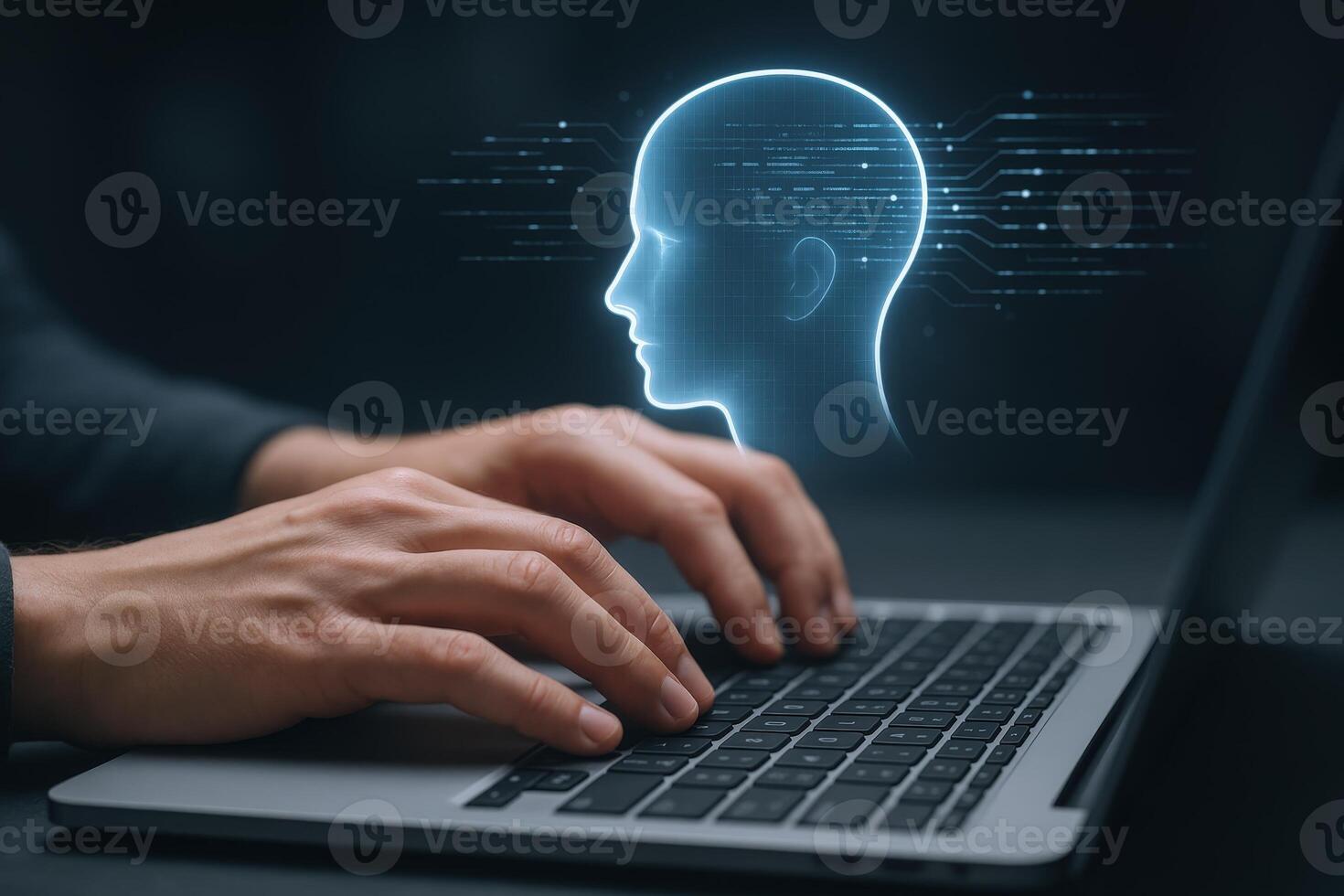 Artificial Intelligence Concept Hands on Laptop Keyboard with AI Profile Visualization for Technology Innovation Pro Photo