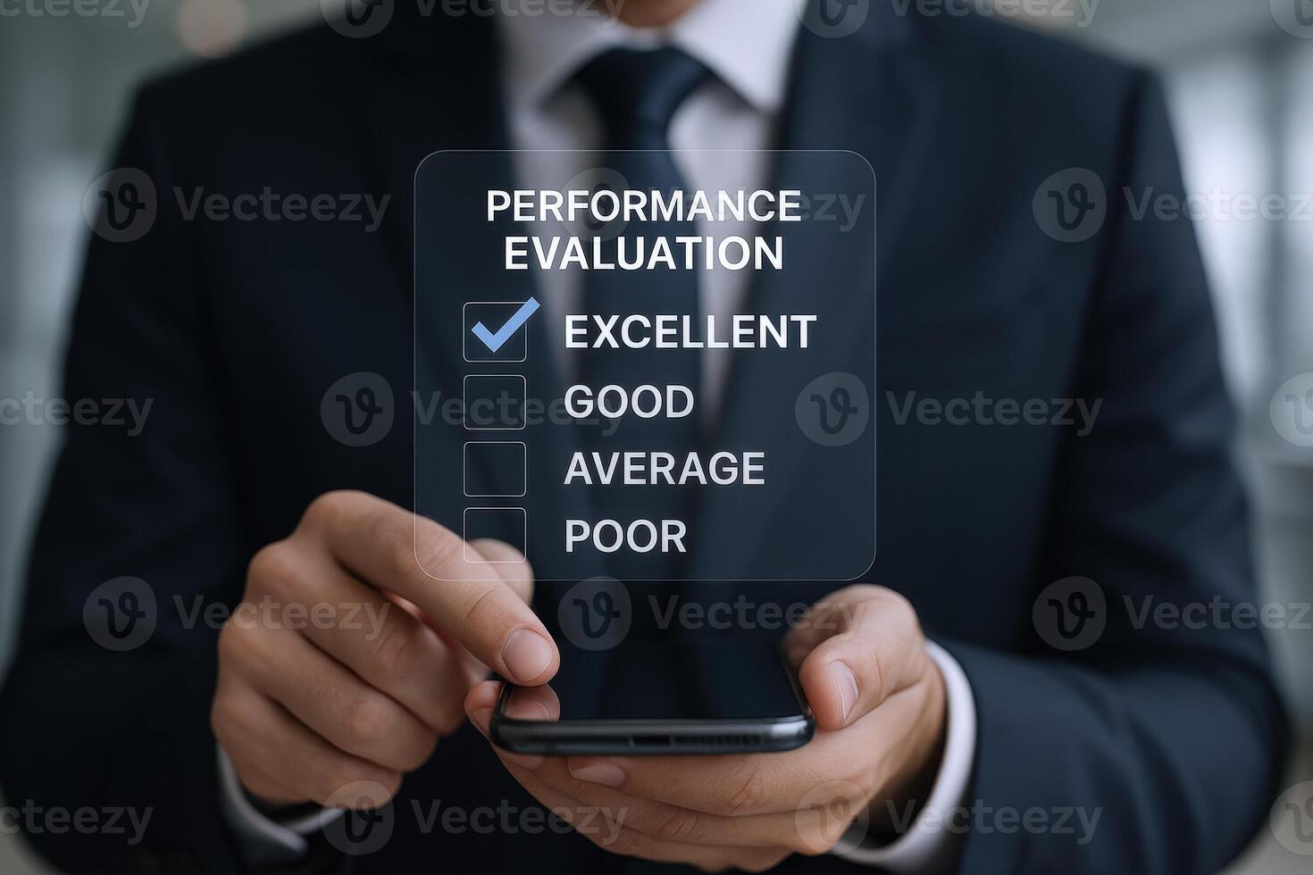 Performance Evaluation Concept Businessman Holding Phone Displaying Excellent Rating on Virtual Checklist Interface Pro Photo