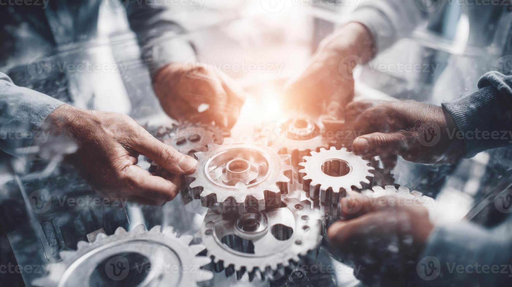 Teamwork Concept Hands Arranging Gears Together, Symbolizing Collaboration, Business Synergy, and Problem-Solving for Innovation Pro Photo