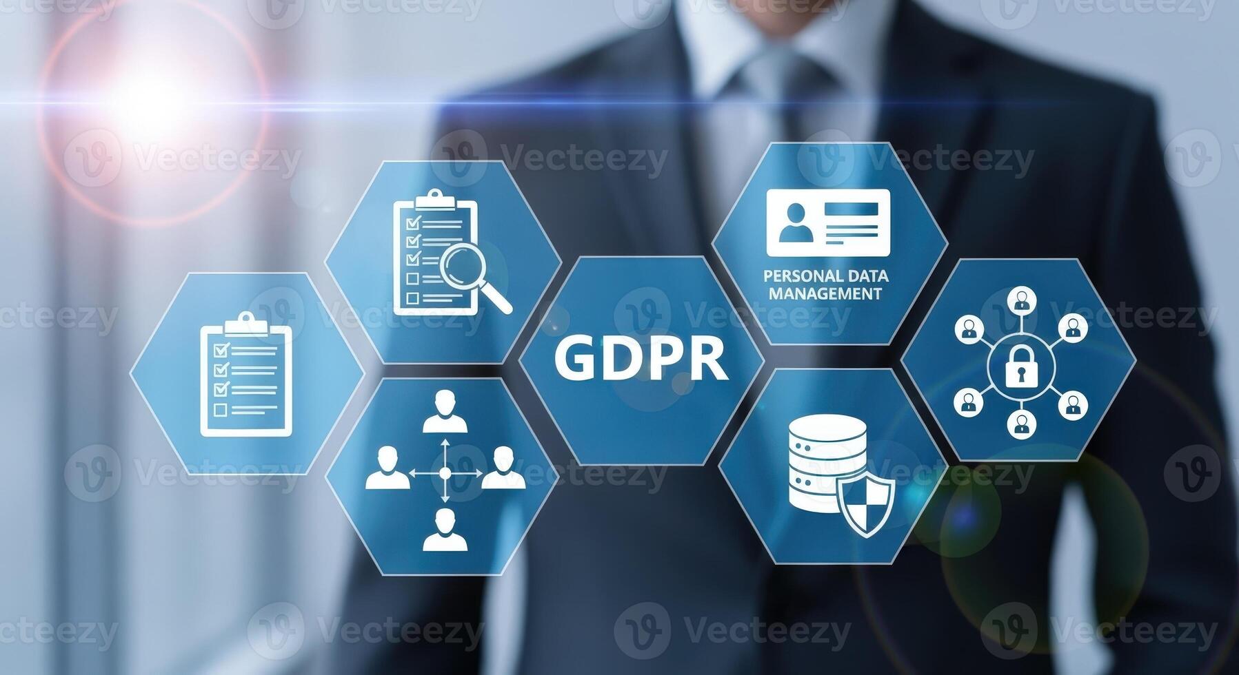 GDPR Compliance Concept with a Businessman in a Suit and Informational Graphics Overlay Pro Photo