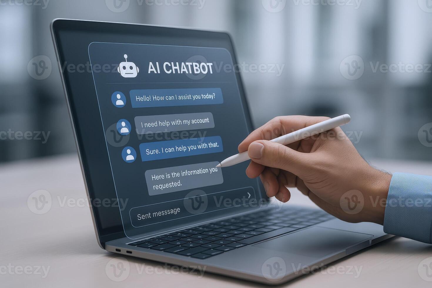 AI Chatbot Interface on Laptop Screen Displaying Conversation with Human Hand Using Stylus for Input Pro Photo