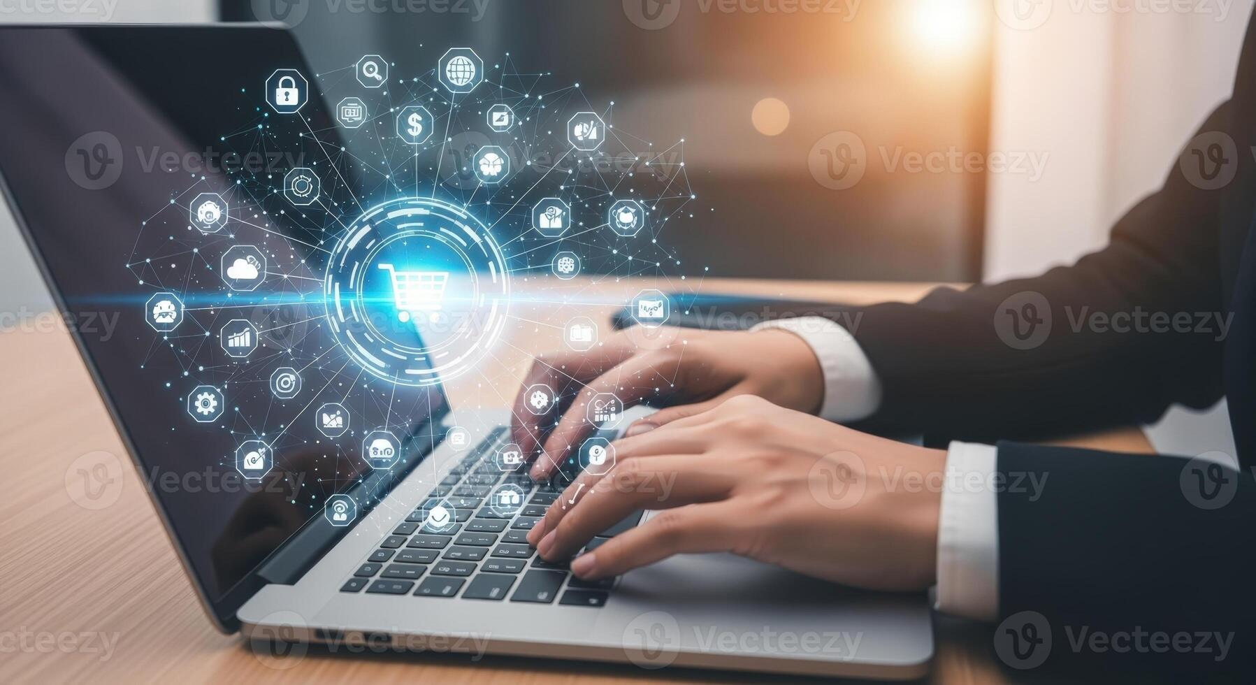 Professional Uses Laptop for Online Shopping with Abstract Cyber Security and Data Protection Interface Pro Photo