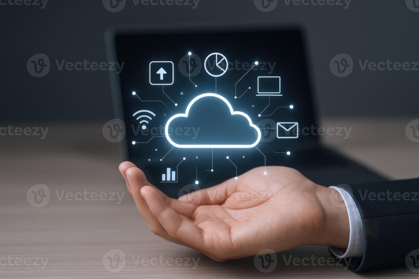 Cloud Computing Technology Display A Hand Holding a Digital Cloud with Connected Services Pro Photo