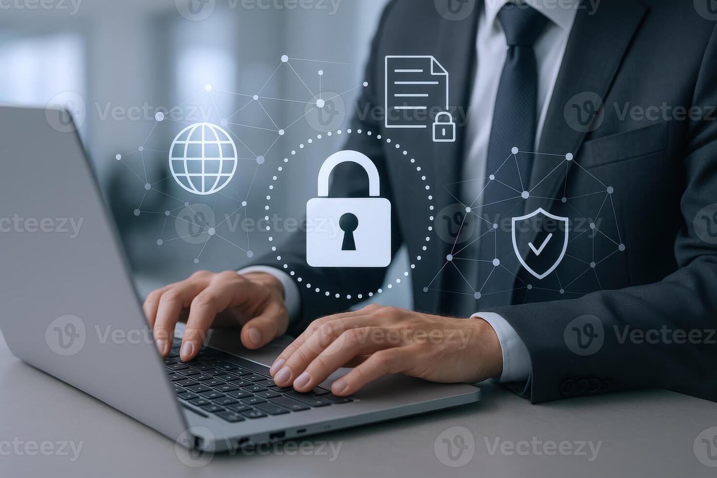 Cybersecurity Professional Securing Data on Laptop with Encryption, Representing Data Protection and Network Security Solutions Pro Photo