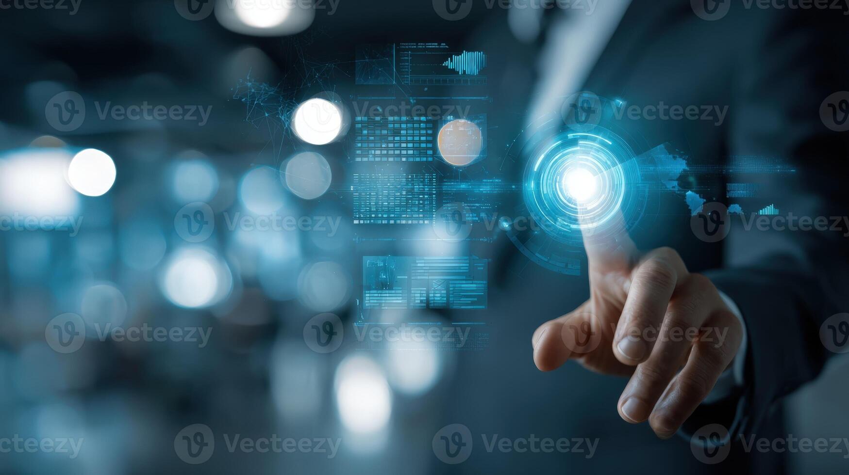 Man Activating Futuristic Interface with Touch, Highlighting Digital Transformation and Advanced Technology Solutions Pro Photo