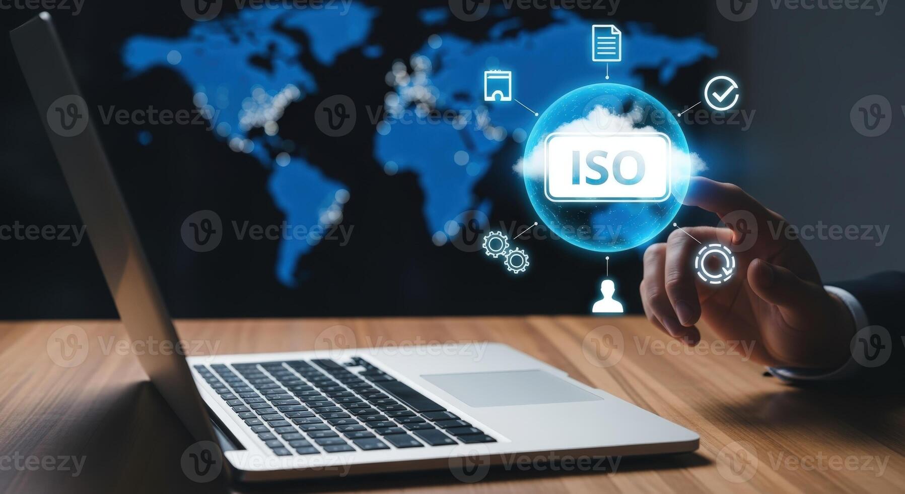 Global Standards Implementation Hand Interacting with ISO Cloud Interface on Laptop for Business Process Optimization Pro Photo