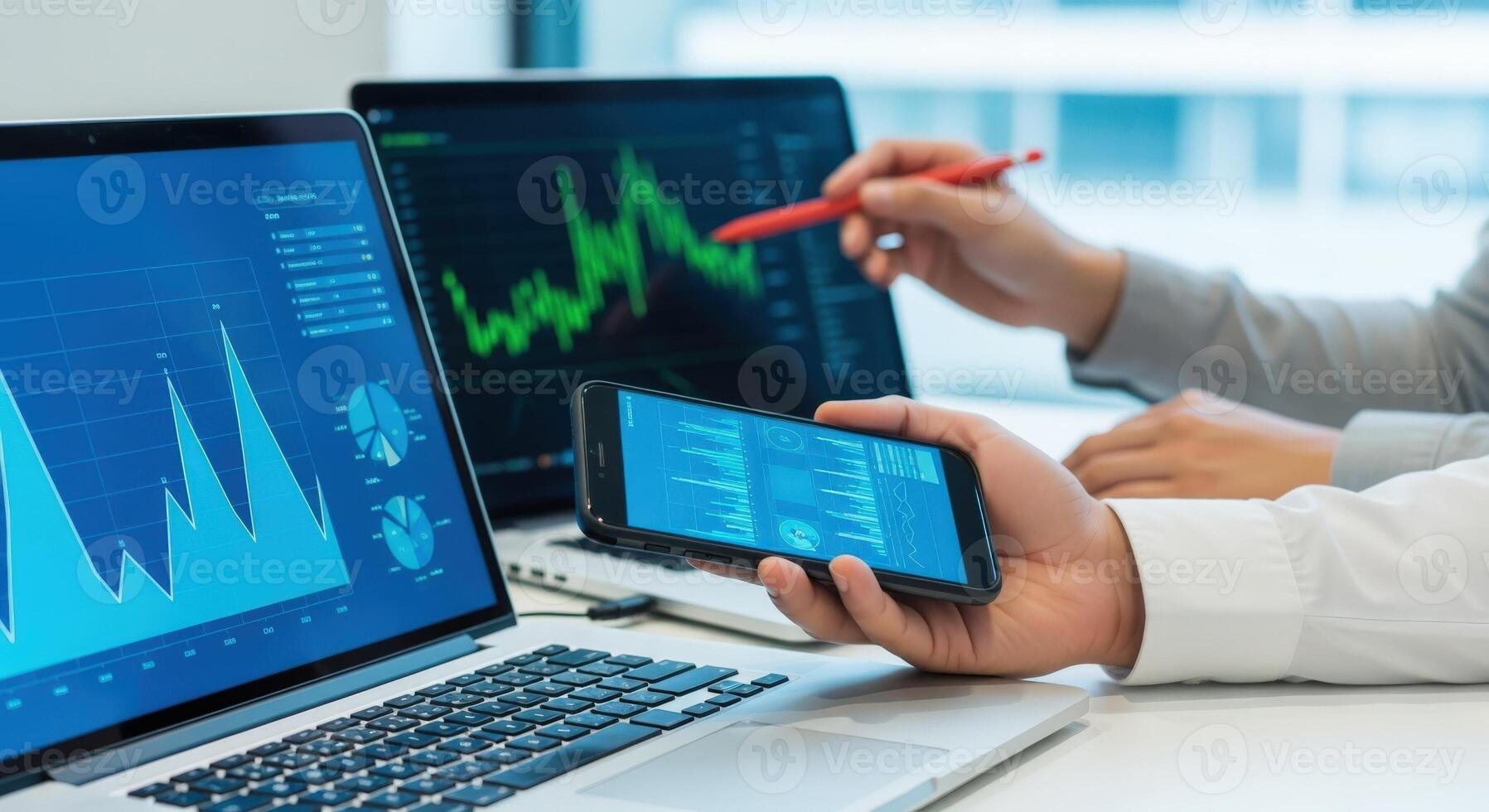 Financial Analysts Examining Stock Market Data on Multiple Screens and a Smartphone During Trading Session Pro Photo