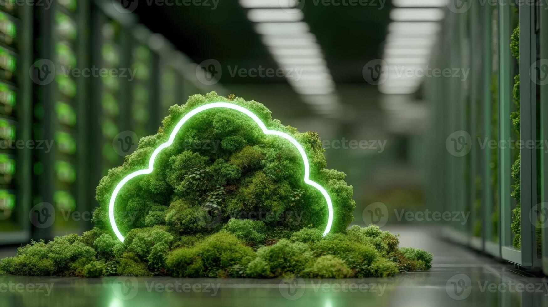 Green Computing Concept Moss Cloud with Neon Outline in Data Center, Sustainable IT Infrastructure Pro Photo