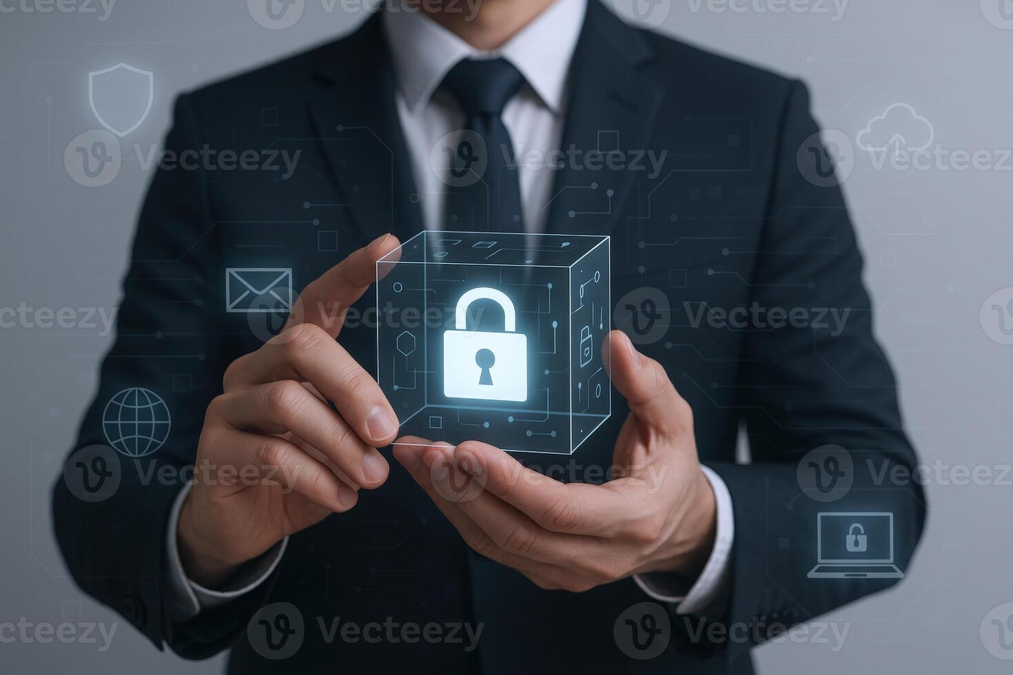 Cybersecurity Concept Man Holding Digital Lock Cube, Representing Data Protection and Network Security Pro Photo