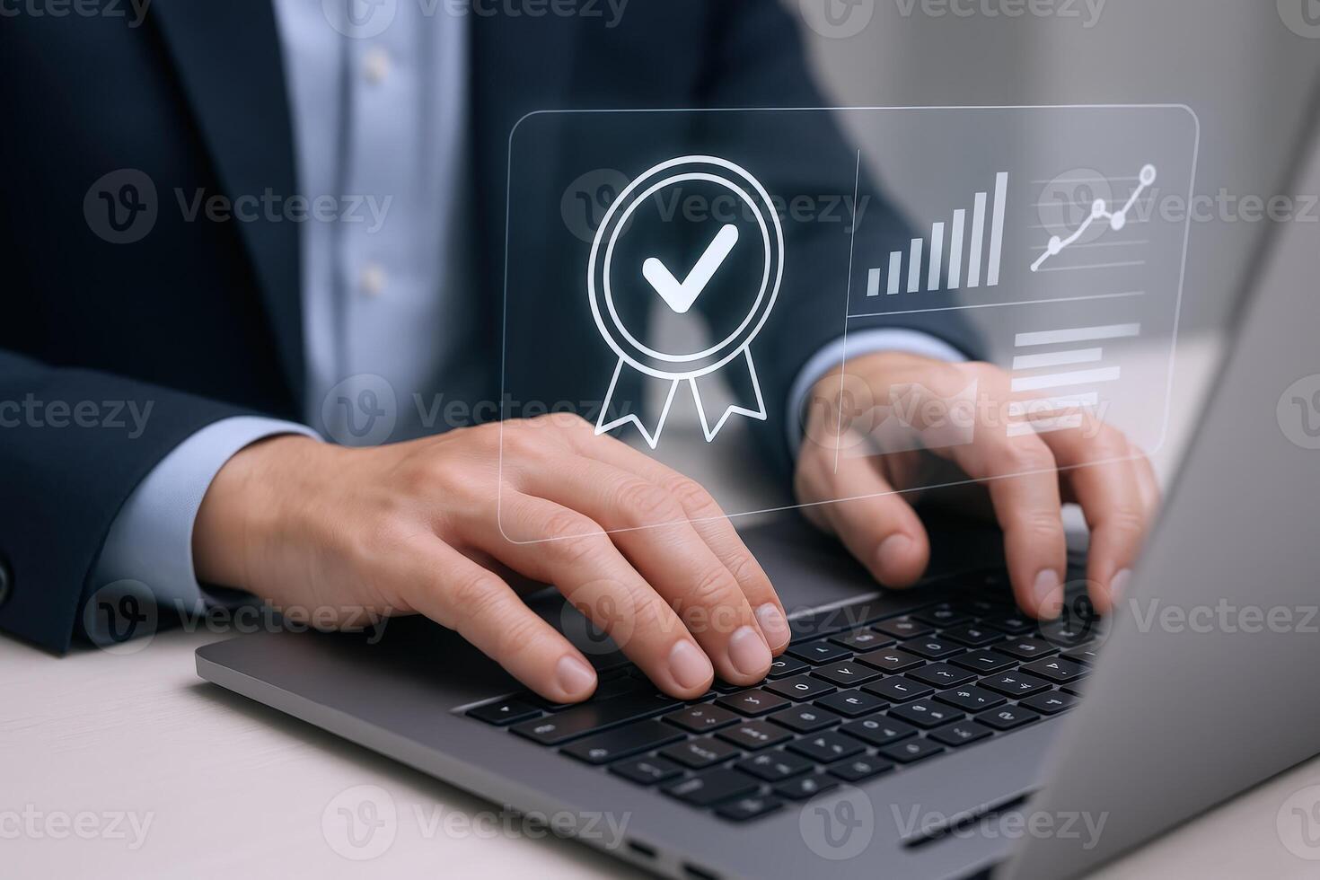 Professional using laptop showing quality assurance graphic, highlighting business efficiency and success with data analytics Pro Photo