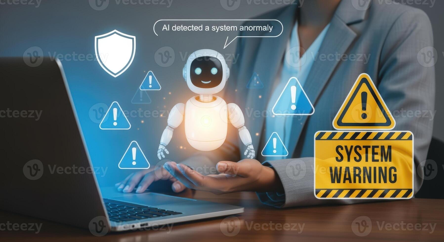 System Anomaly Detected by AI Robot Cybersecurity Alert with Visual Warnings and Businesswoman Pro Photo