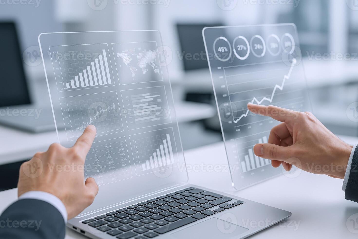 Futuristic Data Analysis Businessman Interacting with Holographic Interface Displaying Financial Charts and Business Analytics Pro Photo