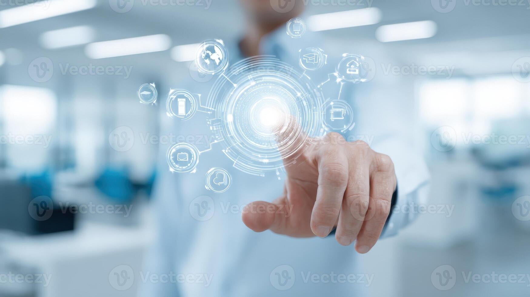 Man Interacting with Digital Interface Demonstrating Modern Technology, Automation, and Connectivity in a Bright Workspace Pro Photo
