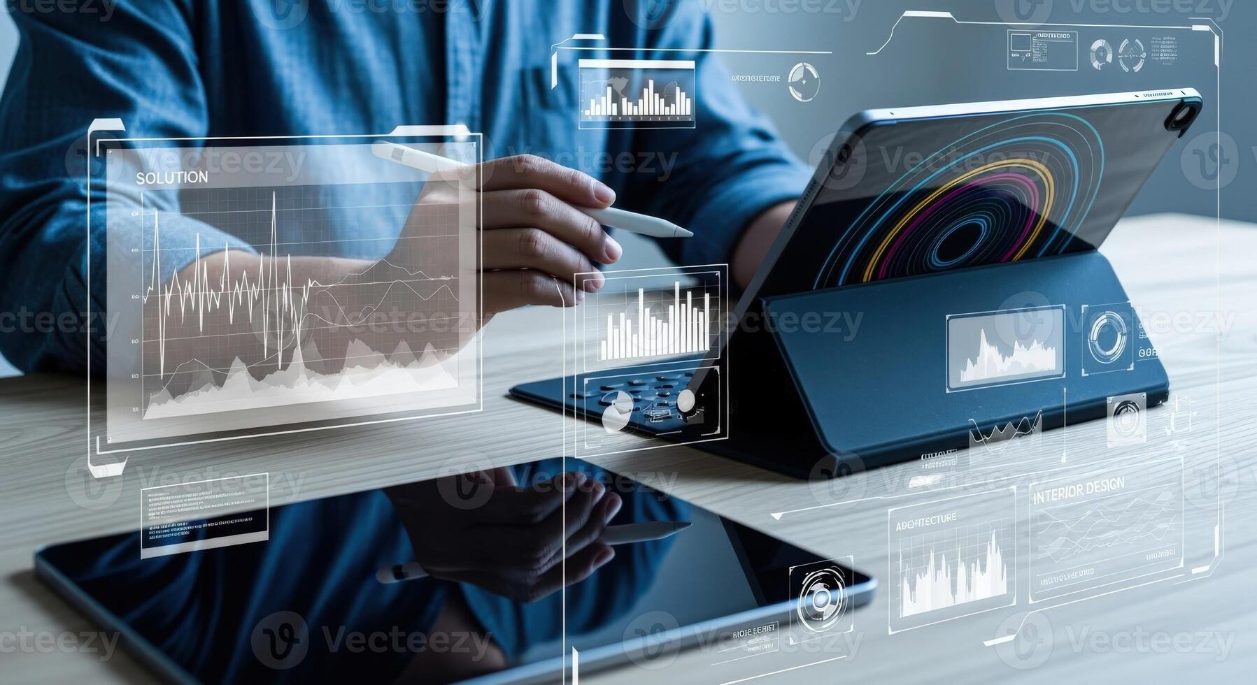 Data Analysis on Tablet Man Using Digital Devices with Information Overlays for Business Strategy Pro Photo