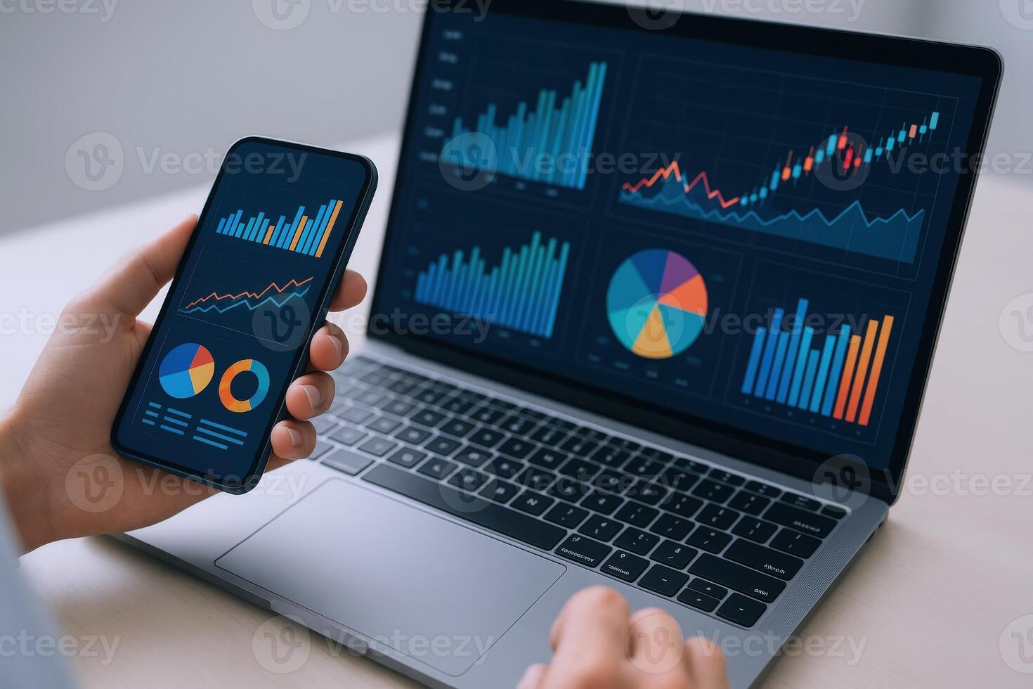 Data Analytics on Mobile and Laptop Screen Displaying Charts and Graphs for Business Strategy Pro Photo