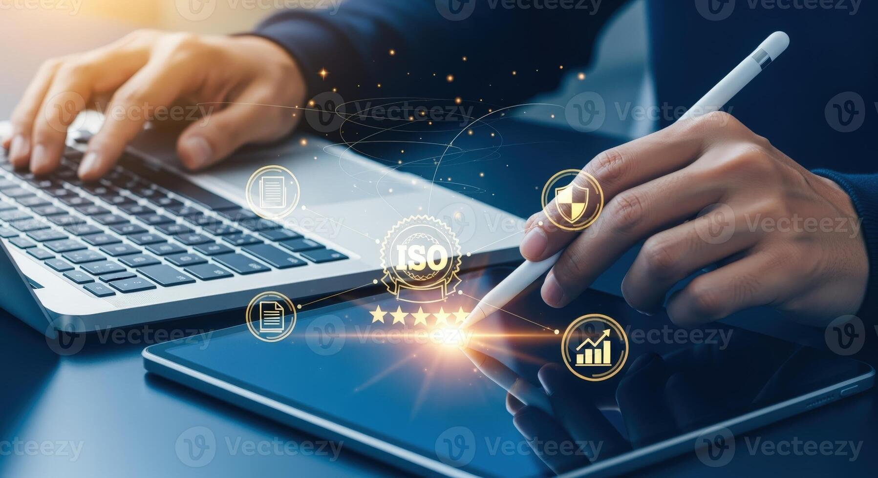 Business Professional Implementing Quality Standards on Laptop and Tablet for Performance Excellence and Optimization Pro Photo