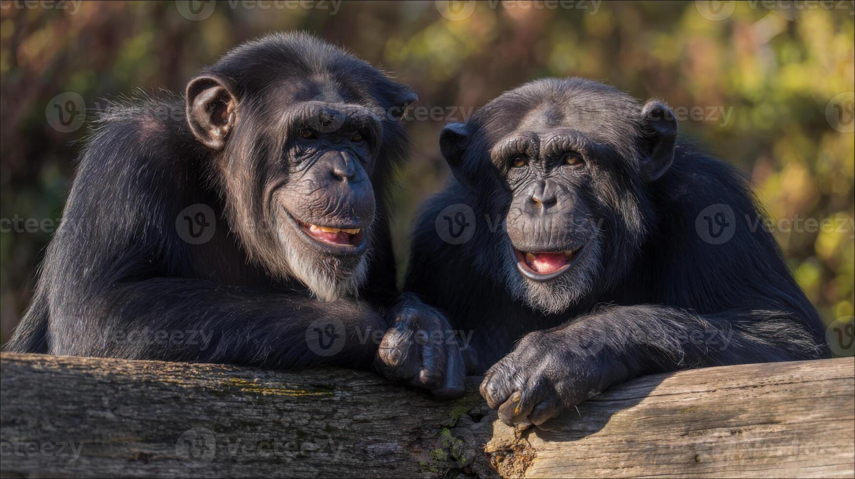 Two Chimpanzees Resting on a Log, Showing Affection and Kinship in a Natural Habitat Pro Photo