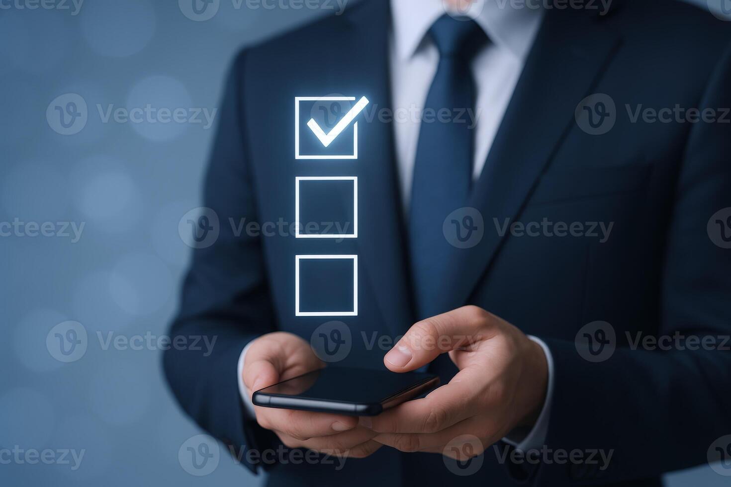 Businessman using a smartphone to complete a digital checklist with a marked box in the first position Pro Photo