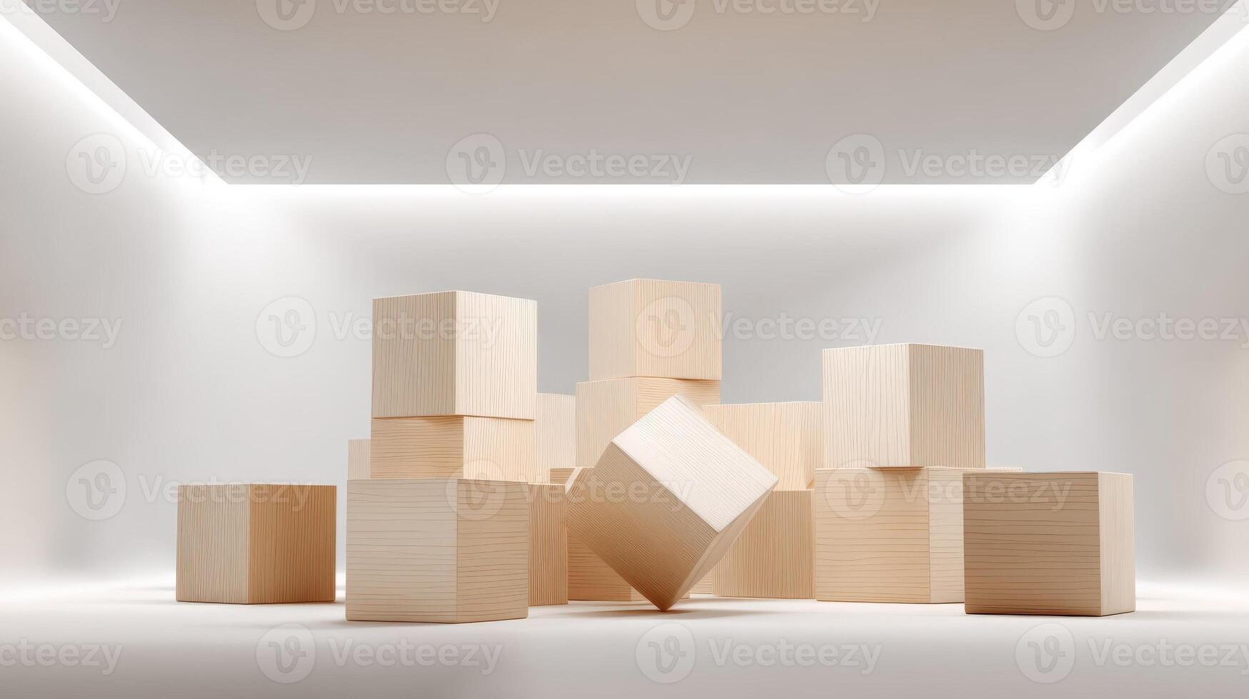 Minimalist Display with Wooden Cubes Modern Exhibition Space for Product Showcase, Abstract Architecture and Geometric Composition Pro Photo