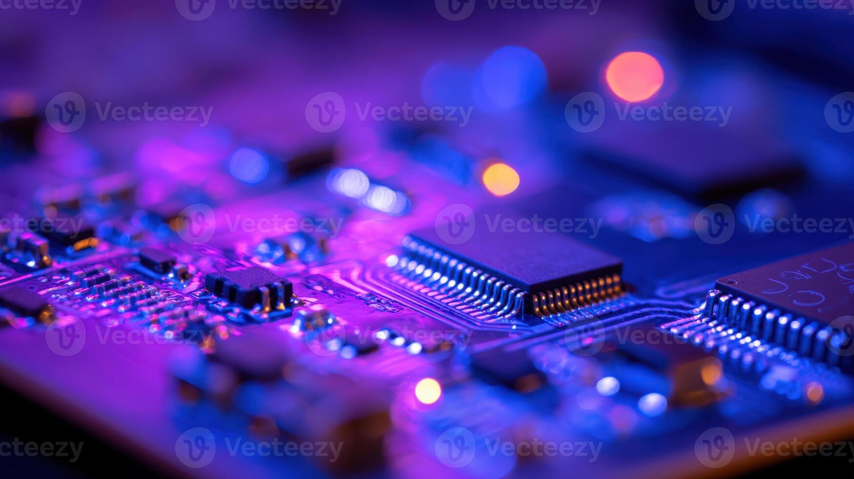 Circuit Board Components Illuminated with Blue and Purple Light Showing Technological Advancement and Connectivity Pro Photo