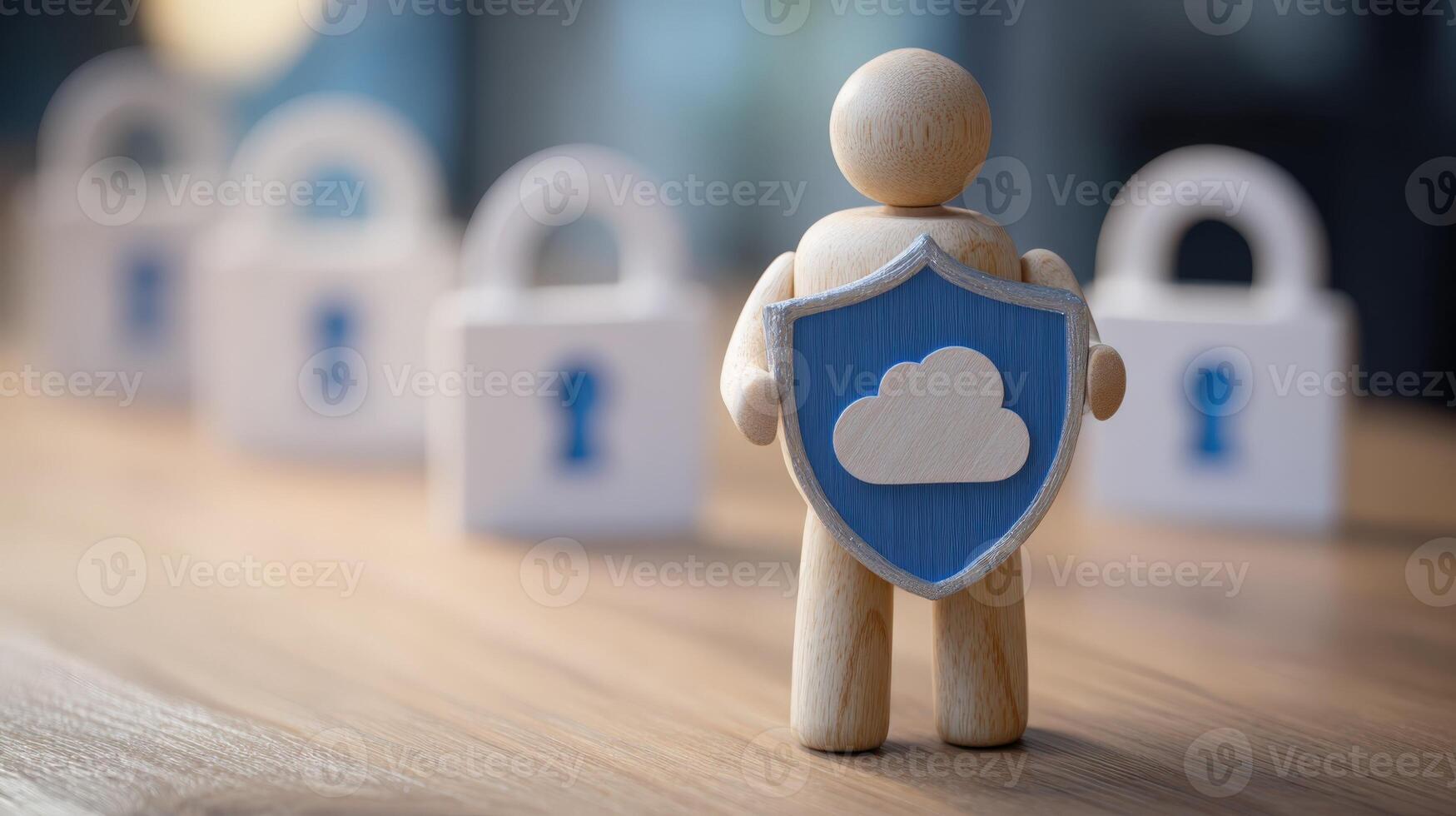 Cloud Security Concept Wooden Figure Protecting Data with Shield, Padlocks Representing Cybersecurity Measures Pro Photo