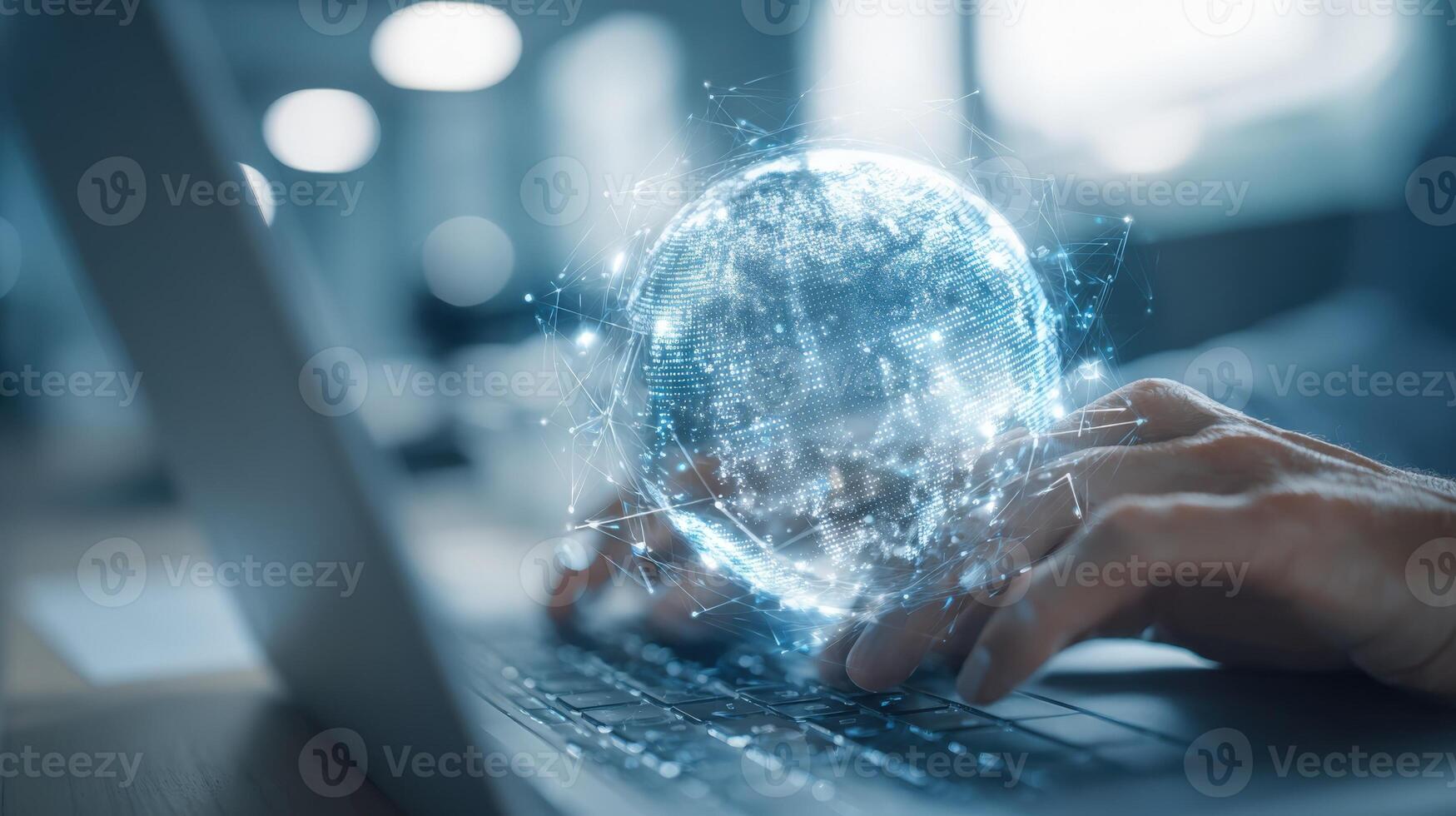 Digital Globe Connection Hands on Laptop with Global Network, Data Flow, and Online Communication Pro Photo