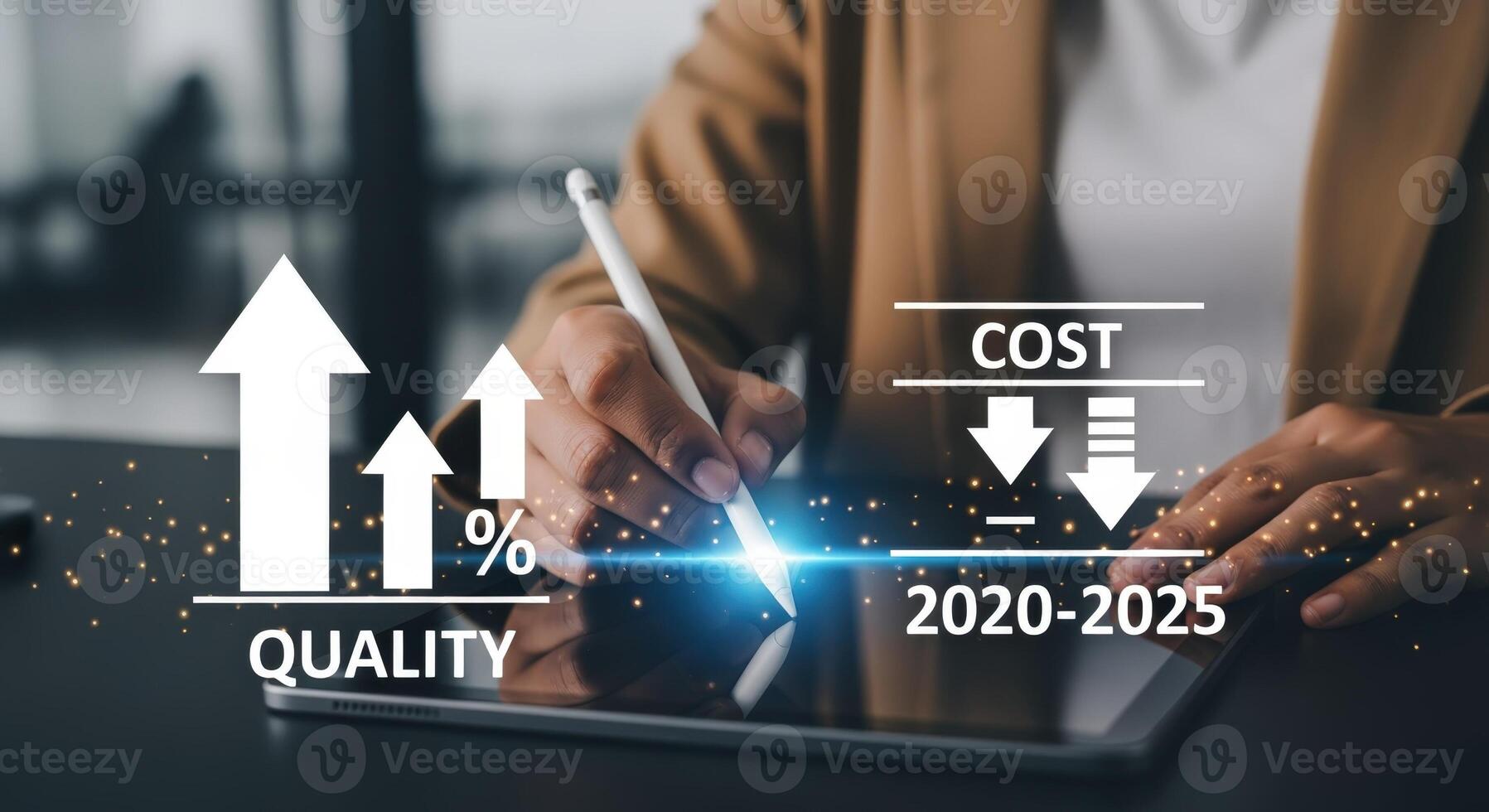 Businesswoman analyzing performance metrics on a tablet to improve quality and reduce costs using technology Pro Photo