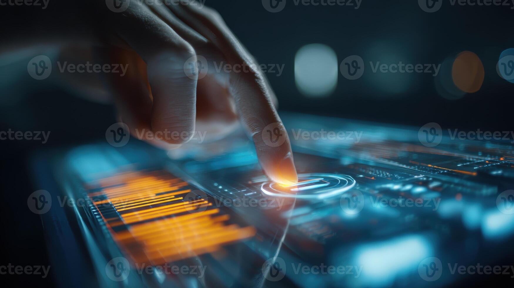 Finger pressing virtual button on digital screen interface with futuristic data and information technology Pro Photo