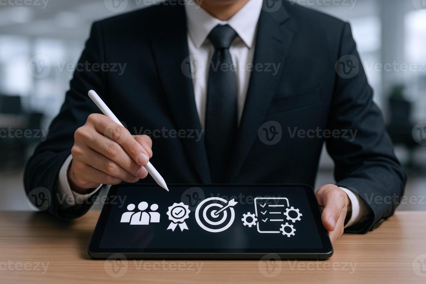 Business professional demonstrates project management concepts on a tablet, highlighting teamwork, quality, targets, and task completion Pro Photo
