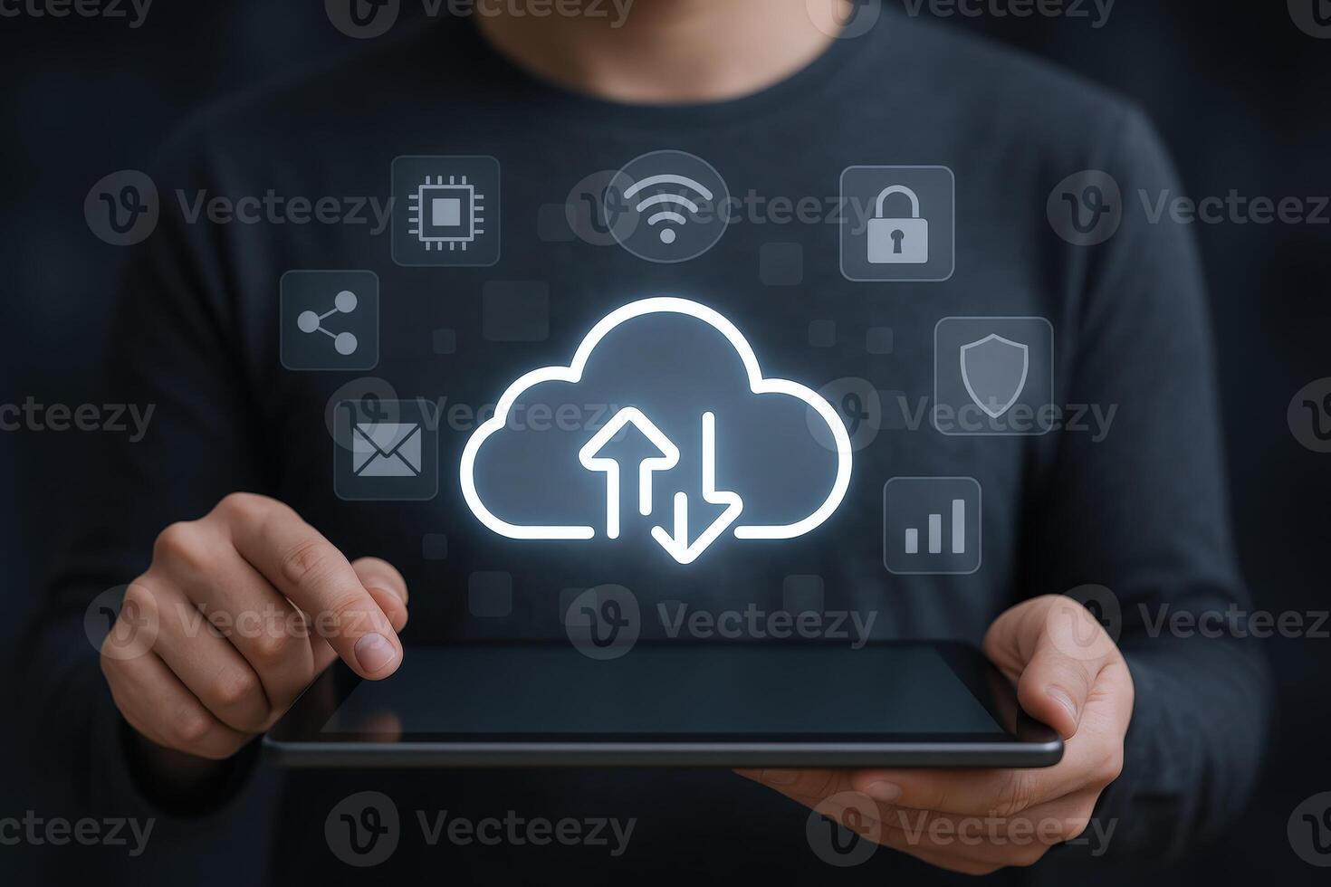 Cloud Computing and Data Storage Man Holding Tablet with Cloud Icon Displayed in Foreground Pro Photo