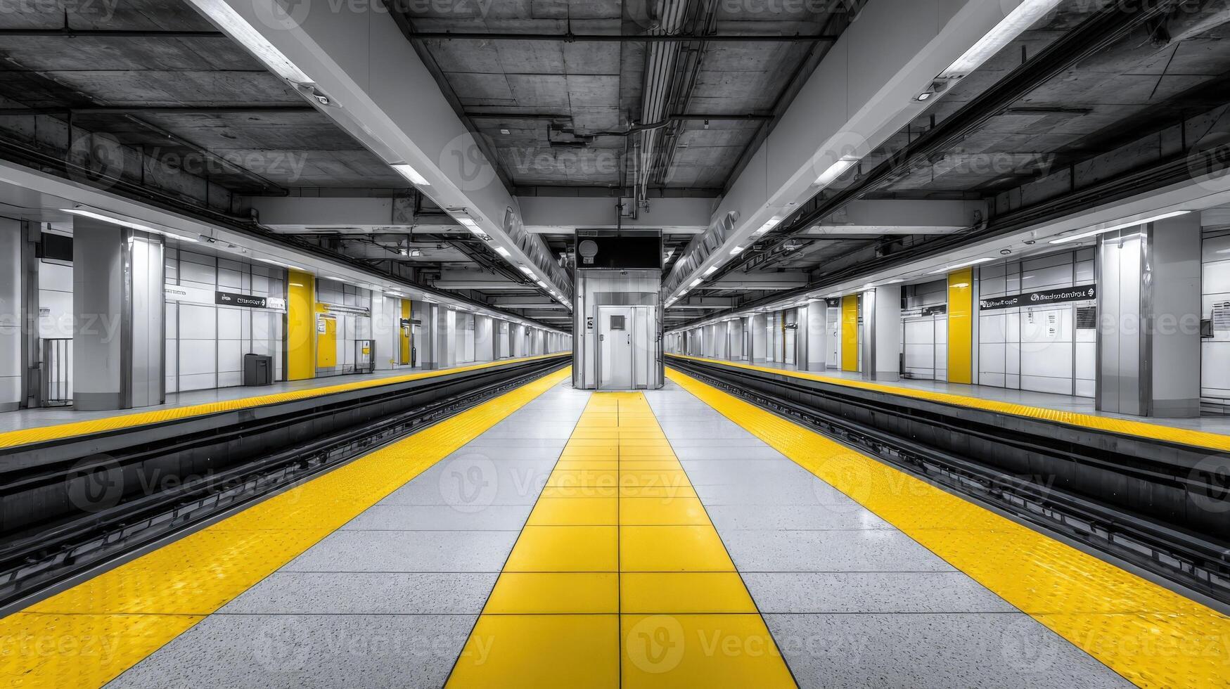 Modern Subway Station with Geometric Yellow Platform Markings and Concrete Architecture in Urban Setting Pro Photo