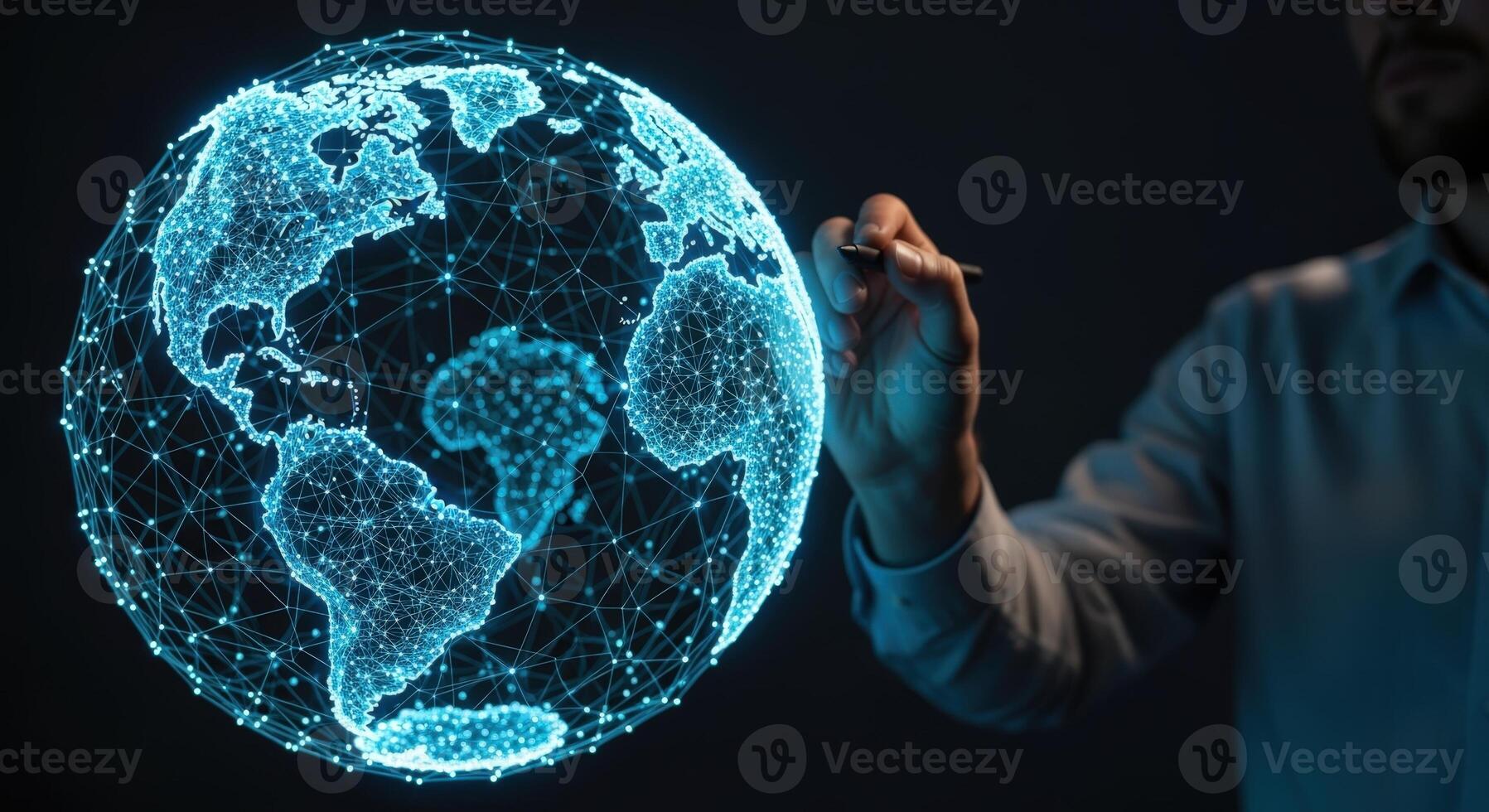 Global Digital Network Visualization Man Interacting with Futuristic Holographic Earth Interface in Dark Studio Pro Photo