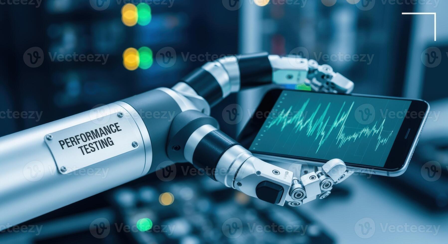 AI Powered Mobile Performance Testing Robotic Arm Holding Smartphone Displaying Data Analytics in a Tech Environment Pro Photo