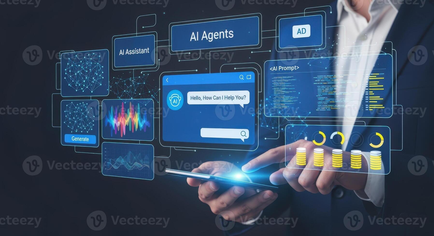 AI-Powered Business Businessman Using Smartphone to Interact with Artificial Intelligence Agents and Digital Interface Pro Photo