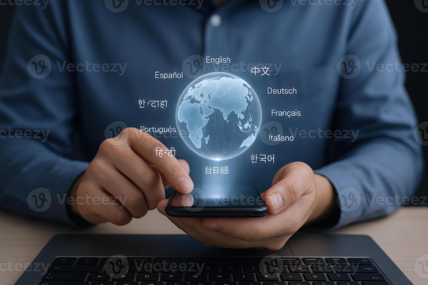 Global Communication and Translation Man Using Smartphone App for Multilingual Interpretation and International Connectivity Pro Photo
