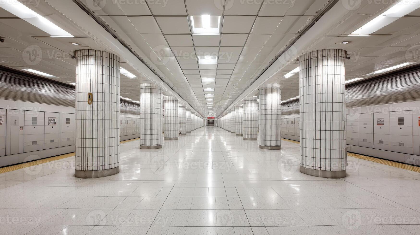 Empty Subway Station Platform with Ceramic Tiled Columns and Floor, Illuminated by Recessed Ceiling Lights Pro Photo