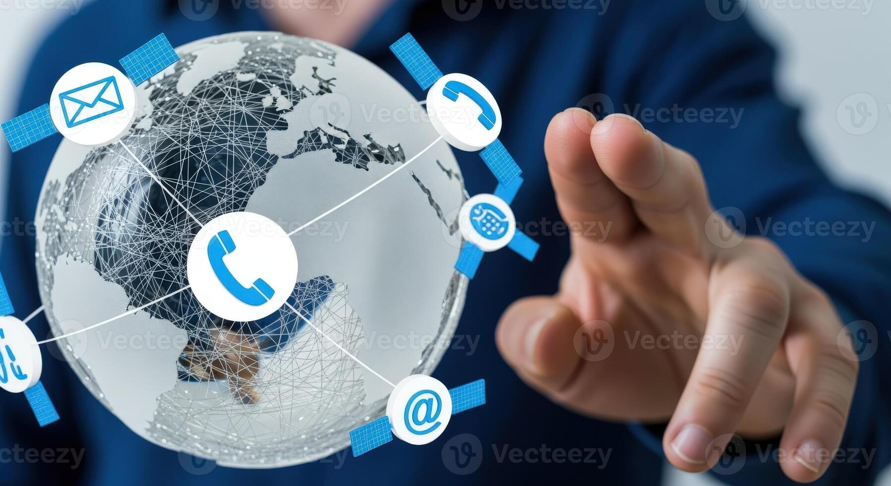 Global Communication Network Concept Hand Touching Digital Globe with Connection Icons, Representing Worldwide Business Pro Photo