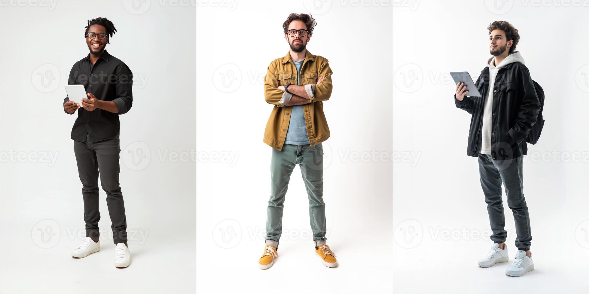 Three software developers using digital tablet and smiling on white background Pro Photo